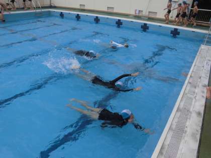 体育の学習では,水泳を頑張っています。楽しく学習を進めていく中で,クロールや平泳ぎの泳ぎ方を身に付け,長い距離を泳ぐことが出来るようにと思っています。また,息継ぎや泳ぎ方のコツをつかめるよう練習したり,新しい泳ぎ方に挑戦したりしてほしいと思います。