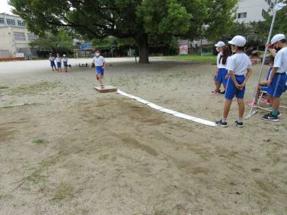 体育では,はばとびをしています。片足踏み切り・両足着地をすることを意識してとんでいます。自己最高記録を更新できるように頑張っています。