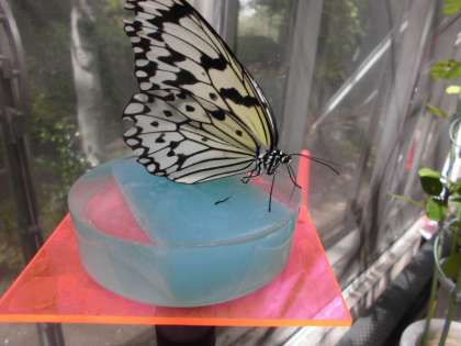 科学センター内のチョウの家では、オオゴマダラ・リュウキュウアサギマダラ・シロオビアゲハの3種のチョウを観察することができました。子どもたちは,ゆっくりと飛んでいるオオゴマダラや蜜を吸っているシロオビアゲハ、オオゴマダラの幼虫の姿や金色のさなぎの様子、オオゴマダラの足が4本に見えることなど、いろいろな不思議に出会うことができました。