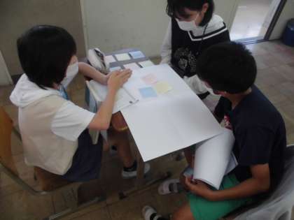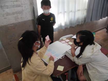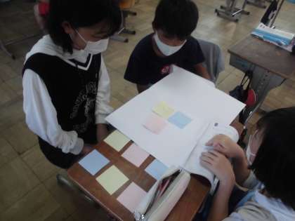 国語の学習では,話し合いをするために大切な事を考えながら「より良い学校生活をするためには」というテーマで話し合い活動をしています。グループごとに付箋を使い自分の考えを明確にしながら話し合いを進めています。考えを広げる話し合いと考えをまとめる話し合いがあることを学習しています。