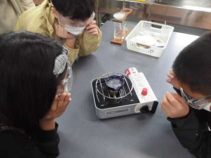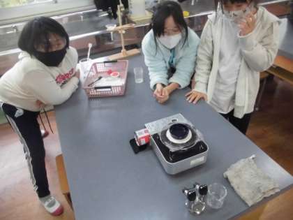 理科の学習では、食塩を溶かした水溶液について学習をしています。今回は、水溶液から水の量を減らしていくために蒸発をして食塩を取り出すことができるか確かめました。子どもたちは、無色透明の食塩水から白い食塩が出てくることに驚きながら実験をしていました。