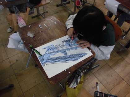 図工の学習は、版画に取り組んでいます。作品のテーマは、「見てみたい建物や仏像」というテーマで、世界遺産の神社やお寺、実際に訪れてみたい建物を表現しようと取り組んでいます。題材は、タブレットを使って調べたりもしました。世界中の素敵な建物や日本にある歴史的な建造物などを彫刻刀で表現するように、線彫り・面彫りを組み合わせて彫っていこうと思います。また、白黒刷りで、背景や面彫りをしたところに配色を工夫して仕上げていきたいと思っています。素敵な作品の完成をご期待ください。