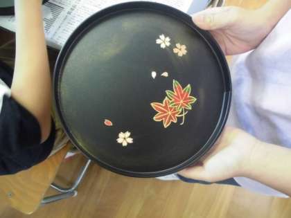伝統工芸「京漆器(蒔絵)の体験学習」では、貴重な体験をすることができたように思います。京漆器の特徴でもある金色の粉を蒔くことで、黒いお盆に金色の線が色鮮やかに浮かび上がってきました。出来上がったお盆は、湯飲みやお菓子をのせたり、飾ったりすることもできるそうです。素敵な作品ができました。