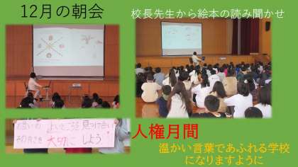 12月は人権月間です。校長先生からは「ありがとう」の言葉のあふれる絵本の読み聞かせがありました。また児童朝会でも企画委員から今月の言葉の発表がありました。お互いの良さを大切に、ぽかぽか言葉であふれる学校になりますように。