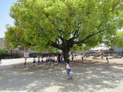 くすのきの下に、3年生が集まり体育の授業です。