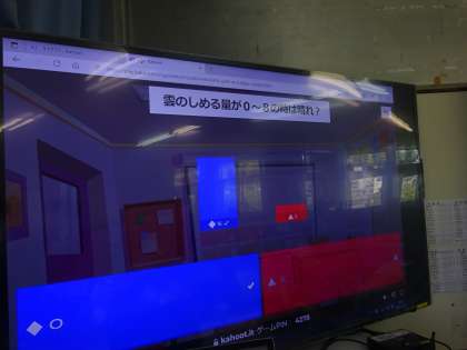 5年生の教室をのぞくと、GIGA端末をつかって楽しく教科のクイズでもりあがっていました。オンラインの力を借りて、クイズ大会ができます。