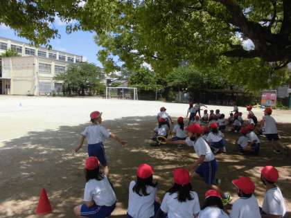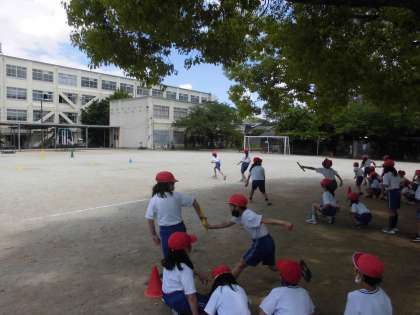 体育の学習では、リレーをがんばっています。チームごとに走順を考え頑張っています。
