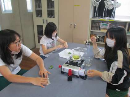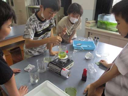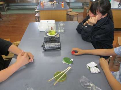 写真は、畑のジャガイモの葉を使って実験をしている様子です。