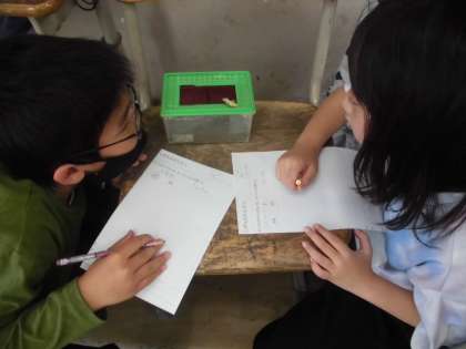 理科の学習では、アゲハチョウの成長の様子を観察しました。子どもたちは、幼虫の体の色が変わることや緑色の幼虫の体を触るとオレンジ色の角を出すことなどに驚きながら、さなぎの様子なども観察しました。来週くらいには、アゲハチョウのの成虫の姿が見れるかと期待をしています。