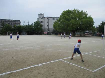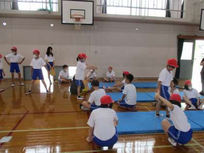 5、6年生のお兄さん、お姉さんに優しく教えてもらいながら、ソフトボール投げや立ち幅跳びなどに取り組みました。