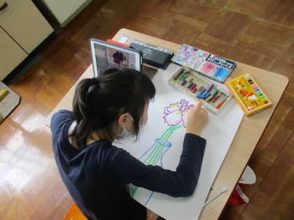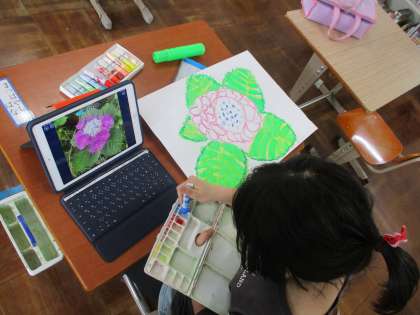 クレパスや絵の具、クーピーなど様々な道具を使い、葉脈や鋸歯(きょし、葉のギザギザ)を再現している児童もいました。