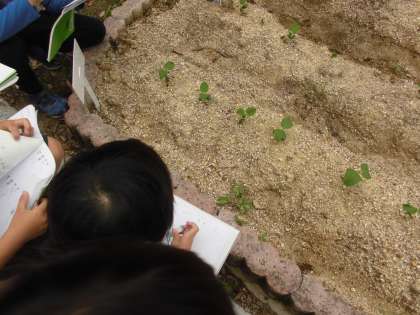 学校園の植物の観察に行きました。春に植えた大豆やオクラ、ヒマワリ、ホウセンカなどが少しずつ大きく成長しています。子どもたちは、子葉の様子や本葉の様子のちがいや大きさ、形などに注目しながら観察をしていました。