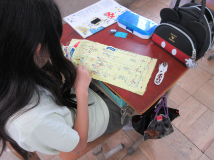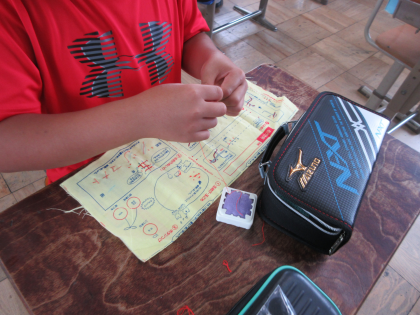 名前を縫っています。玉結び・玉止めが難しいようで,苦戦している姿がみられます。