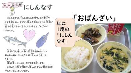 今日の献立は、ごはん・牛乳・にしんなす・かきたま汁です。年に1度の「にしんなす」は、海から遠い京都市で昔から食べられてきたおかず、いわゆる「京のおばんざい」です。にしんとなすのように相性の良い食べ物通しのことを「であいもん」とも言います。