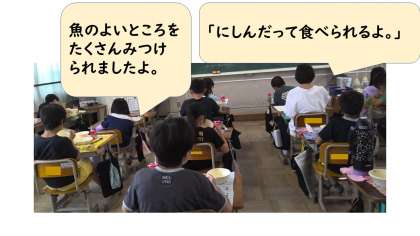 魚の良さについて学習した4年生1組。普段は魚が苦手な子も「今日、食べられた!」と嬉しそうに言ってくれました。「なすは食べられへんわ〜」と言っていた子も、ごはんと一緒に味わえたようです。京都市の給食では京都で昔から食べられてきたおかずも、受け継いでいきたくて出しています。「これ好きやねん」という子も学年が上がるごとに増えていきますよ。ちょっとずつ好きな食べ物や、味を覚えていってほしいです。