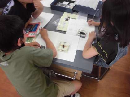 理科室の昆虫標本を使い、昆虫の体のつくりを調べました。昆虫には、頭・むね・はらの3つの部分があることや羽が4枚あること。そして、あしの数が6本あること、触覚が2本あることなどを確認しました。ダンゴムシやクモなどは、昆虫の仲間ではないことがわかりました。