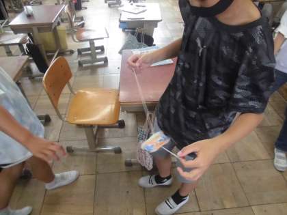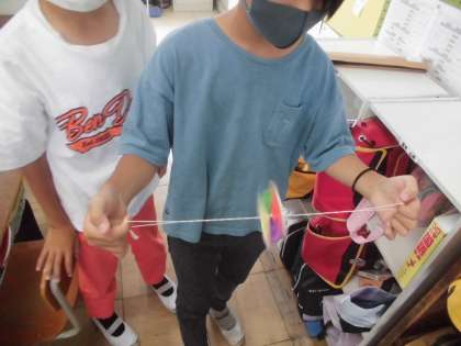 図工の学習で「オリジナルのビュンビュンごま」を作りました。牛乳パックなどの紙パックに絵を描いたり、模様を描いたりして、ひもを通しました。初めはうまく回すことができなかった子も、だんだんとコツをつかんで上手に回すことができ大喜びでした。