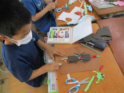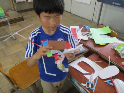 2回目のパタパタストローです。子どもたちのアイディアがどんどん広がっています。作品が出来上がると、「見てみて!」とお互いに見せ合いっこをしています。女の子たちのグループでは、お人形さん遊びが始まっていて、微笑ましかったです。
