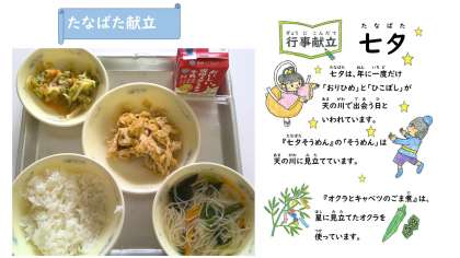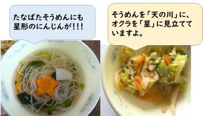 今日の献立は、ごはん・牛乳・きつねどんぶりの具・オクラとキャベツのごま煮・たなばたそうめんでした。ひと足早く、七夕献立を楽しみました。そうめんを「天の川」に、オクラを「星」に見立てています。七夕そうめんにも星型のにんじんが入っていました。