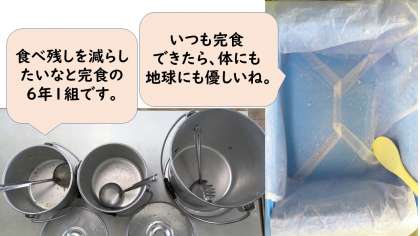 国語の学習で環境のために食べ残しを減らしたいと完食した6年1組。1人1人が食べる力をますますのばして、より健康な体と心をつくってほしいなと願います。