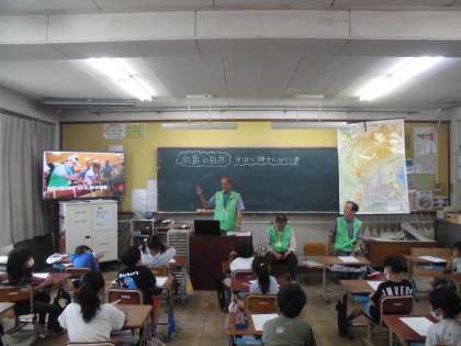 総合的な学習の時間では、地域の自然や伝統、地域の歴史や移り変わりなどを教材にしています。3年生では、宇治川の自然をテーマに伏見楽舎さんをお招きして「宇治川について」「つばめのねぐらでもある宇治川の河川敷にあるヨシ原について」「つばめのくらしについて」などのお話を聞かせていただきました。つばめの巣が校区のいろいろなところにあり、つばめのくらしや生活の様子について詳しく教えていただき、興味深く向島の自然を考えることができました。