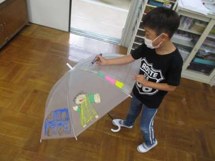透明なビニール傘に、模様を描いたり、紐を吊るしたりといった子ども達の個性が出ています。