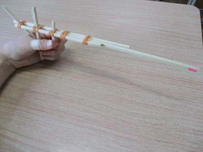 夏といえば、「祭り」ということで、割り箸と輪ゴムを組み合わせた鉄砲作りに取り組みました。輪ゴムを伸ばしたり、結んだりすることに苦戦しながらも、子どもたちは楽しみながら活動していました。出来上がった鉄砲を持ちながら、片目を閉じる子や両手で構える子などドラマに出てくる役者になりきっている子ばかりでした。