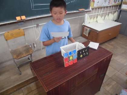 今日から2学期が始まりました。子どもたちは夏休みにしかできないようなたくさんの体験もできたようです。今日は、夏休みの自由作品の発表会をしました。子どもたちが工夫をして一生懸命に取り組み、思い出に残る作品ができたことと思います。自由作品などの夏休みの作品は、本館2〜3階の階段の踊り場や、教室の掲示板などに展示したいと思います。 授業参観日・懇談会の際に、ご覧いただけたら思います。ぜひご覧ください。