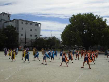 背中にお気に入りの文字を書いた七色のはっぴを着て本番を意識しながら練習をがんばっています。以前よりかけ声が大きくなってきたり、力強い動きを意識したりできててきています。はっぴの色ごとの七つの三角形や曲の最後などにもご注目ください。
