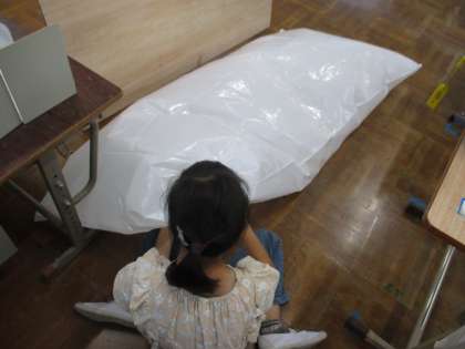 最初は「息で人が持ち上がるの??」と疑っている子ども達でしたが、実際に空気を入れると「すごい膨らんできて、人を持ち上げられそう」という声が出てきました。