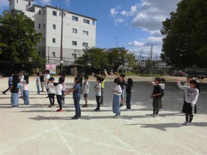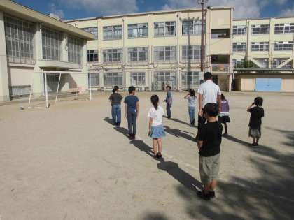 理科の学習では、かげのでき方と太陽の位置の学習をしています。朝礼台の上に棒を立てて9時・10時半・12時・1時半・3時のかげのでき方と太陽の位置の関係を調べました。子どもたちは、時間ごとに影の長さや位置を予想しながら、時刻ごとに影の動きを調べることができました。