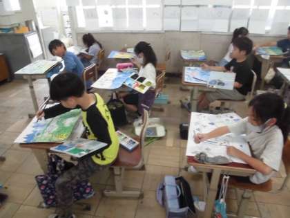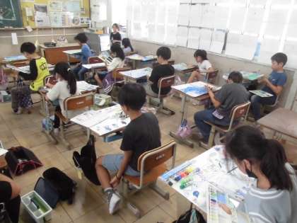 今年の3年生は、「ぼくはアフリカにすむキリンといいます」という本のお話の絵を描きました。どんなお話かというと、退屈なキリンから手紙を受けとったペンギン。姿のわからない相手を想像しながら、お互いを知るためのおかしな文通が始まります。子どもたちは、場面の様子を楽しく想像しながら、ペンや絵の具などを使って描き、素敵な作品ができました。