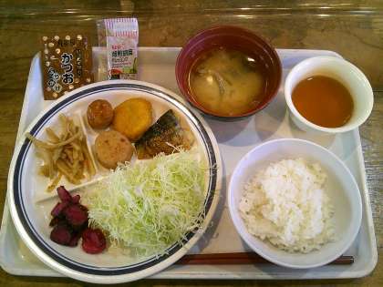 朝食です。今朝は揚げたてのチキンナゲットが大人気でした。ごはんかパン、みそ汁かスープを選ぶことができました。