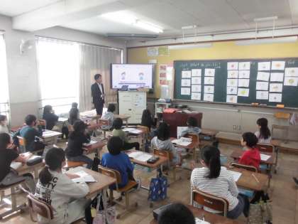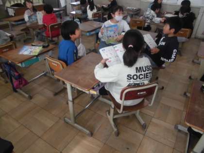 英語の学習では、いろいろなテーマで友達に好きなものをインタビューしました。みんな楽しそうに食べ物やスポーツ、色や果物の中からどんなものが好きかについての受け答えができました。