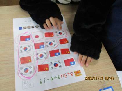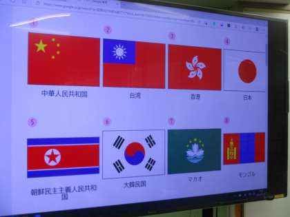 今週のラッキービンゴでは、近隣国の国旗について学習しました。中国や台湾、韓国などの国旗の特徴だけでなく、日本からの距離や方角も確認しました。