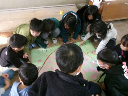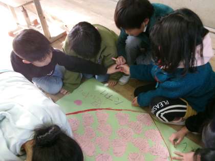 友達のよいところを書いたハートを、模造紙にはっています。