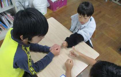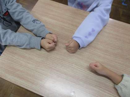 ソーシャルスキルトレーニングでは「親指ゲーム」を行いました。「いっせーので(せ)」の掛け声で親指の数を当てるゲームです。ルールがとても簡単なので、数回練習するとみんなできるようになっていました。