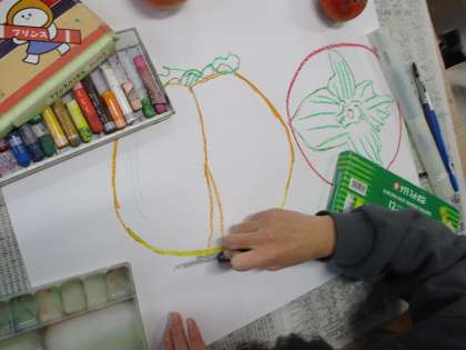 「見たものを見たままで」の学習では、学校内で実った本物の柿を画用紙に描きます。