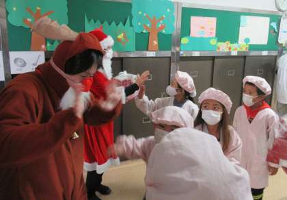 今日は向島小学校にサンタクロースさんとトナカイさんがケーキを届けに来てくれました!