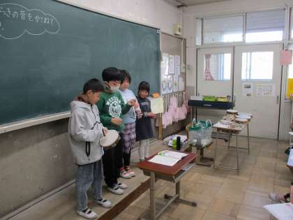 音楽で、「かぼちゃ」という曲に合わせて打楽器の合奏をしました。