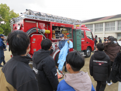地震が起こったことを想定した避難訓練がありました。消防士の方に来ていただき話を聞いたり,消火器の使い方を教えていただきました。また,消防車に積んであるものを実際に見せていただきました。