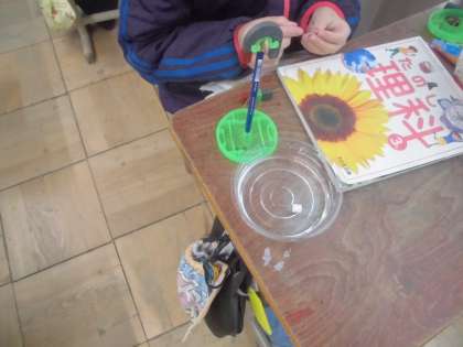 理科の学習では、「じしゃくのふしぎ」をしています。今日の学習では、いろいろな方法で方位磁針の働きをするように、糸でつるしたり、鉛筆の上に置いたり、水に浮かべたりして実験をしました。子どもたちは、興味津々でいろいろな方法を試し、N極が北の方向を向くことを確かめることができました。