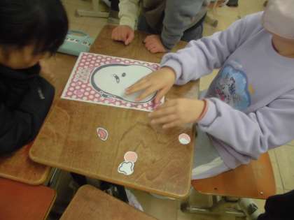 総合の学習では、「むかしから伝わるあそび」をテーマに進めています。子どもたちは、タブレットなどで昔から伝わる「お正月遊び」を調べてきました。実際にやったことのある遊びもあるようですが、経験のない遊びも多かったです。そこで、羽根つきや百人一首、ぼうずめくり、だるま落とし、こまなどのあそび体験をしました。今回は、みんなで「福笑い」をしました。グループごとにたくさんの笑顔があふれていました。