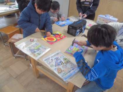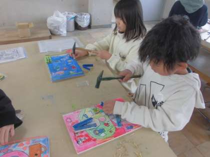 図工の学習では、「くぎうちトントン」をしています。絵をかいた板にくぎを打って、ビー玉を飛ばす仕組みを作っています。何度も釘を打つうちにどんどん上達してきました。色のついた輪ゴムを使って作品を仕上げています。