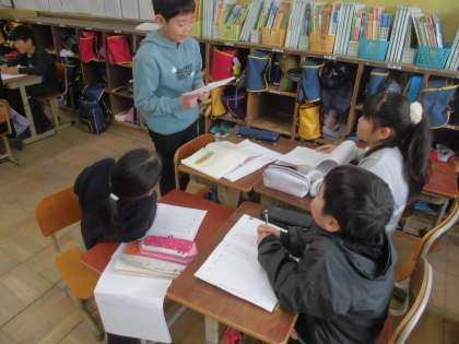 国語では、「ありの行列」を学習しています。今日の学習では、「ありの行列」の話を読んで感想文を書き、班のみんなで感想を交流しました。自分と似ているところや同じような気持ちを書いていたり、自分では気が付かなかったようなことに不思議を見つけたりしていた子もいたようです。