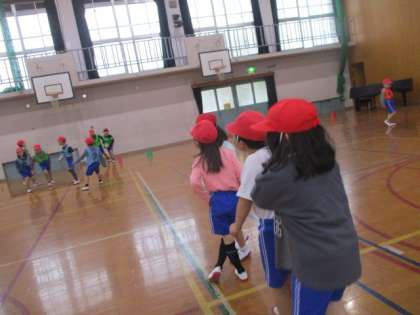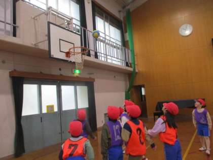 バスケットゴールをめざしてシュートをしていました。