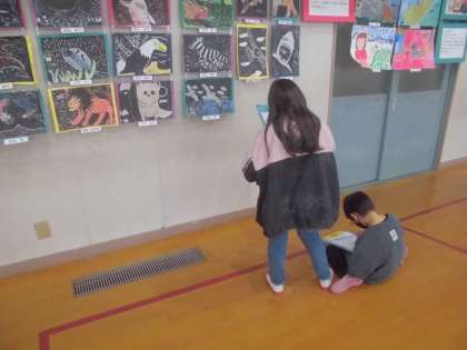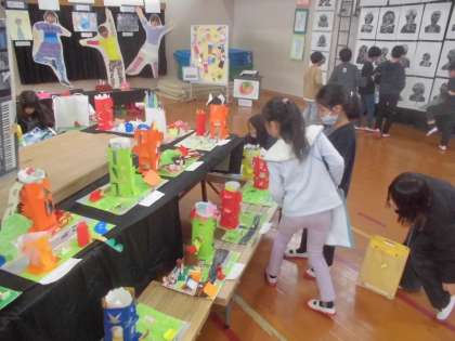 校内「図工展」を体育館で実施しました。一人一人の立体作品と平面作品の2点が体育館に展示され、3年生は、絵の具で色付けした紙に、いろいろな素材を使った版を刷り作った「版画」と「くぎうちトントン」の作品を出展しました。どの学年の作品も素晴らしいものばかりです。