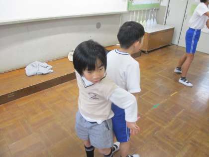 雨で運動場が使えなかったので、教室で運動しました。一つ目は体幹トレーニング、二つ目は歌遊びの「なべなべそこぬけ」や「ロンドンばし」をしました。曲のテンポやリズムを変えながら、楽しく活動できました。