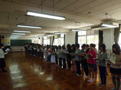 今日は6年生になって初めて学年で集まり,平和集会の練習をしました。初めての練習ということで緊張していたようでしたが,平和集会の意義を考えながら練習することができていました。本番でのがんばりを期待しています。