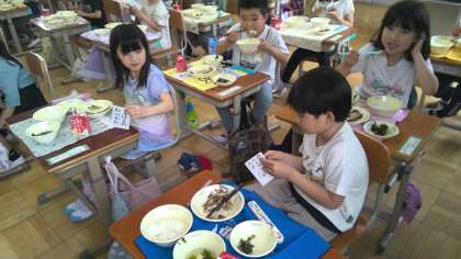 今週、学活の時間に食の学習をしました。苦手な食べ物であっても、少しは食べてみようという意欲がもてるように、栄養教諭の樫先生に『まほうのたべかた』を教えてもらいました。どんな食べ方を教えてもらったのか、お家でも聞いてみてくださいね。